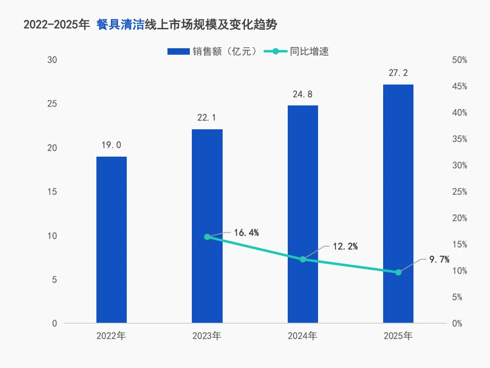 2022年到2025年,餐具清洁线上市场增速持续收窄,2025年增速降至9.7%,品类虽规模稳步增长但已经迈入低速平稳发展阶段。