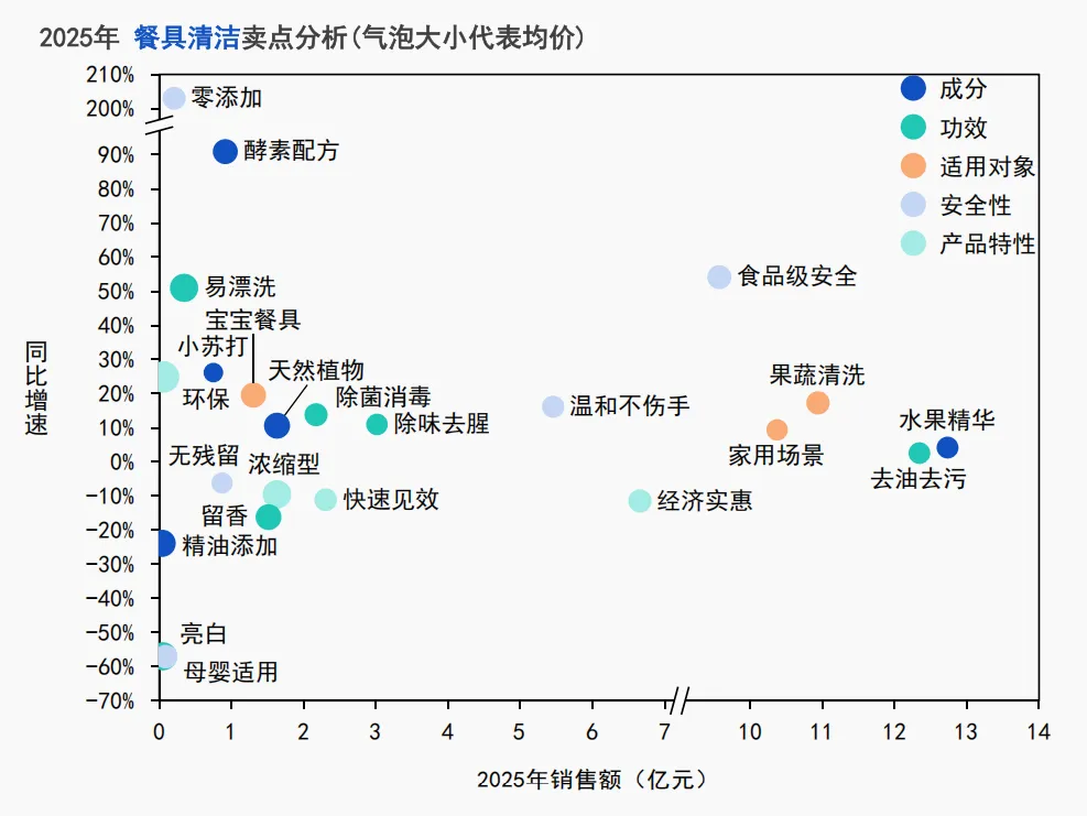 去油去污仍是市场核心消费需求,而食品级安全、酵素配方等卖点的高速增长,标志着消费者对餐具清洁产品的需求已从基础功效满足,向成分安全化方向深度发展。