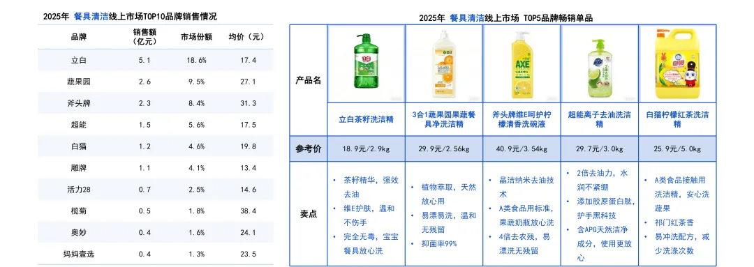 2025年餐具清洁线上市场品牌格局稳定,立白以5.1亿元,18.6%的市场份额保持领先地位。蔬果园和斧头牌紧随其后,市场占有率可观。