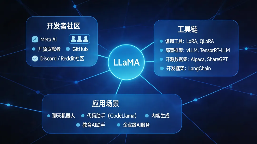 目前围绕LLaMA的工具链,已经形成完整闭环: 微调工具:LoRA、QLoRA让微调成本降低90% 部署框架:Hugging Face Transformers、vLLM支持快速上线