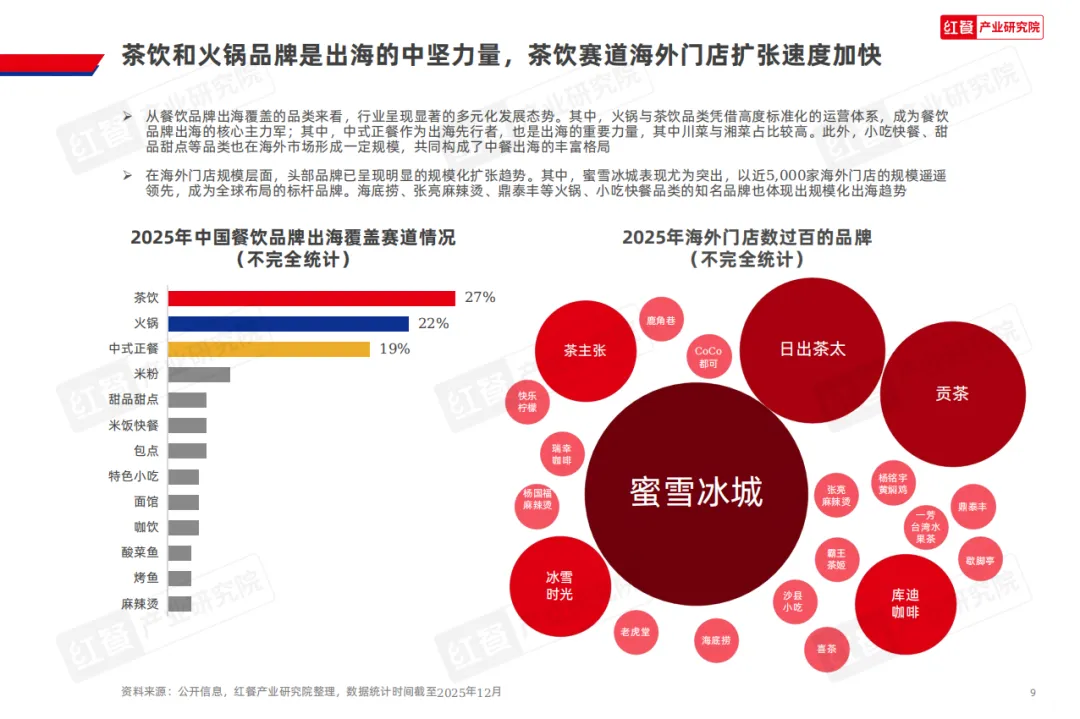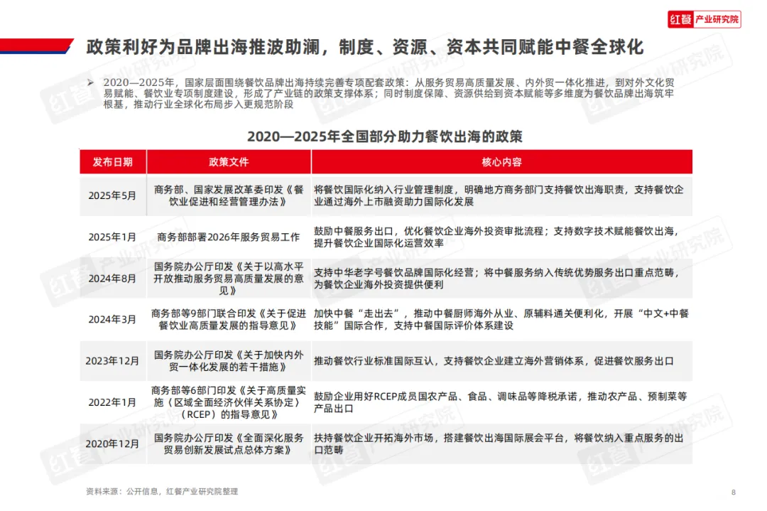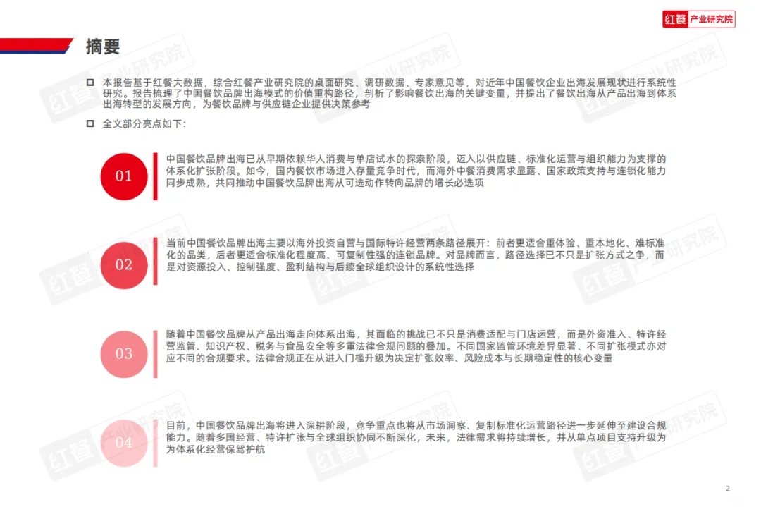 本报告基于红餐大数据,综合红餐产业研究院的桌面研究、调研数据、专家意见等,对近年中国餐饮企业出海发展现状进行系统性研究。报告梳理了中国餐饮品牌出海模式的价值重构路径,剖析了影响餐饮出海的关键变量,并提出了餐饮出海从产品出海到体系出海转型的发展方向,为餐饮品牌与供应链企业提供决策参考