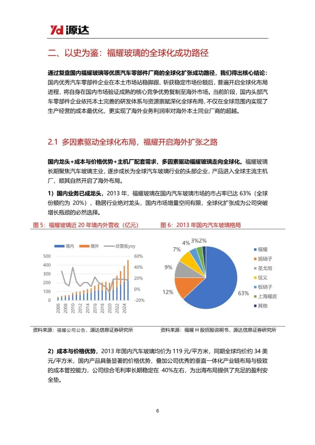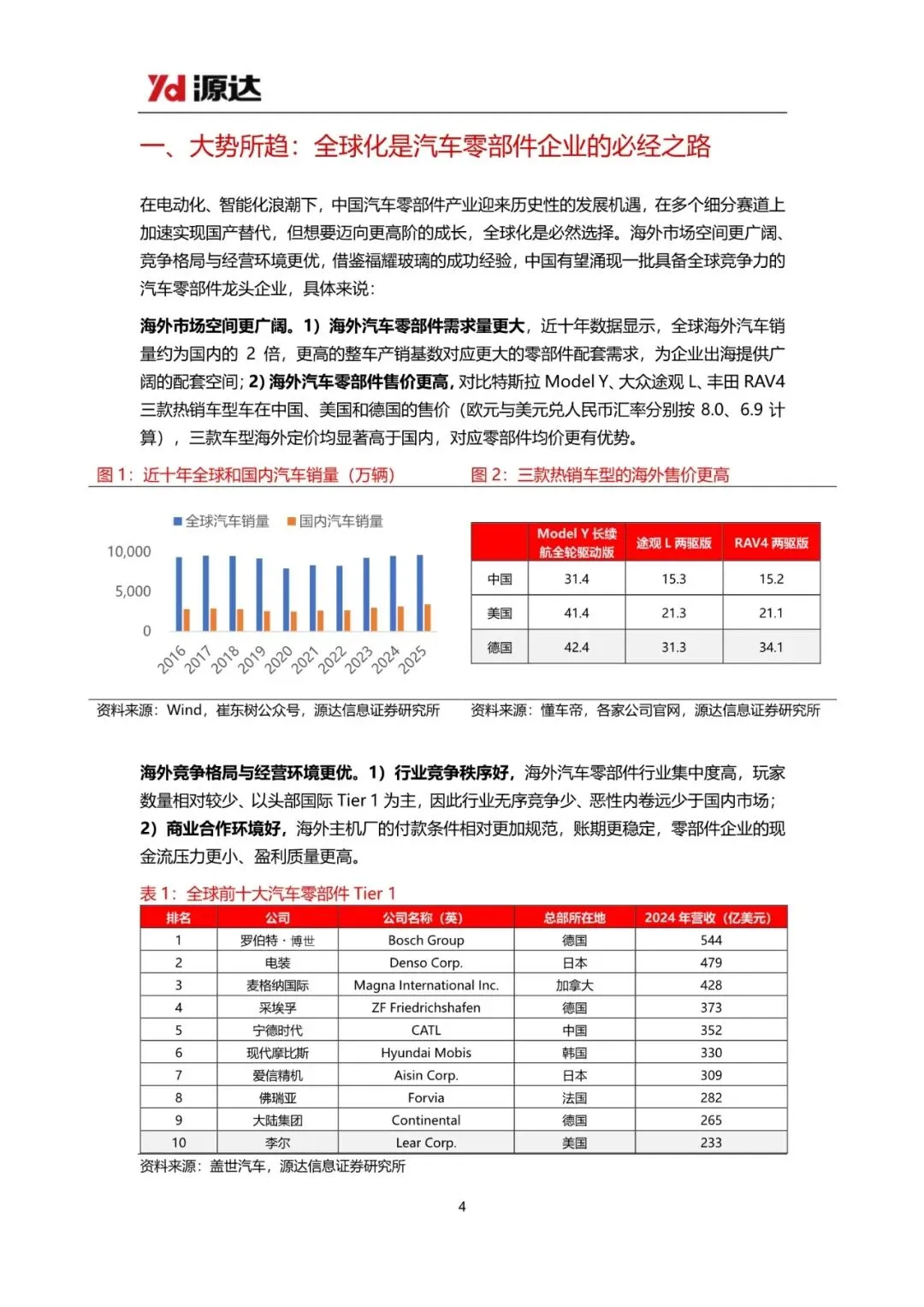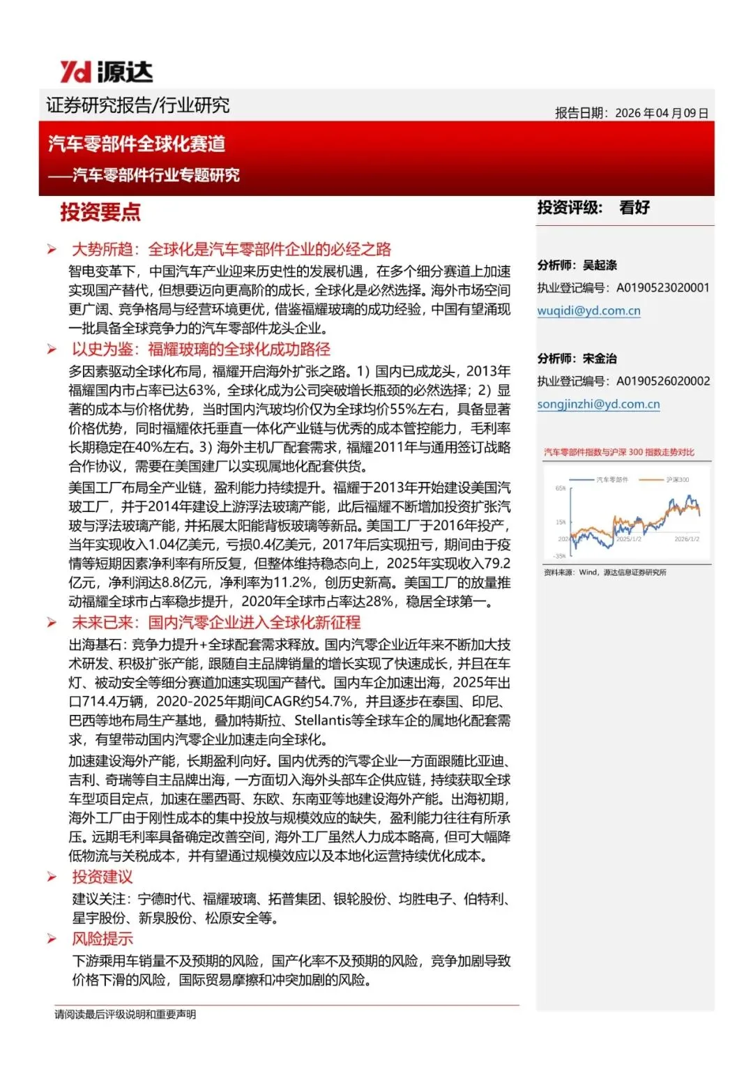 智电变革下,中国汽车产业迎来历史性的发展机遇,在多个细分赛道上加速实现国产替代,但想要迈向更高阶的成长,全球化是必然选择。海外市场空间更广阔、竞争格局与经营环境更优,借鉴福耀玻璃的成功经验,中国有望涌现一批具备全球竞争力的汽车零部件龙头企业。