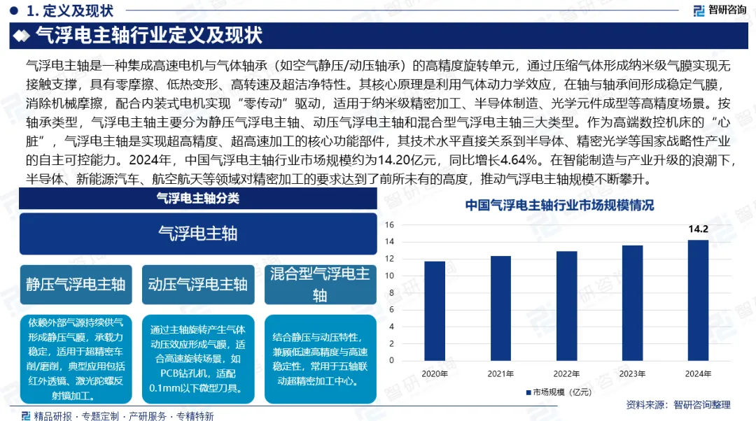 市场规模:作为高端数控机床的“心脏”,气浮电主轴是实现超高精度、超高速加工的核心功能部件,其技术水平直接关系到半导体、精密光学等国家战略性产业的自主可控能力。2024年,中国气浮电主轴行业市场规模约为14.20亿元,同比增长4.64%。在智能制造与产业升级的浪潮下,半导体、新能源汽车、航空航天等领域对精密加工的要求达到了前所未有的高度,推动气浮电主轴规模不断攀升。