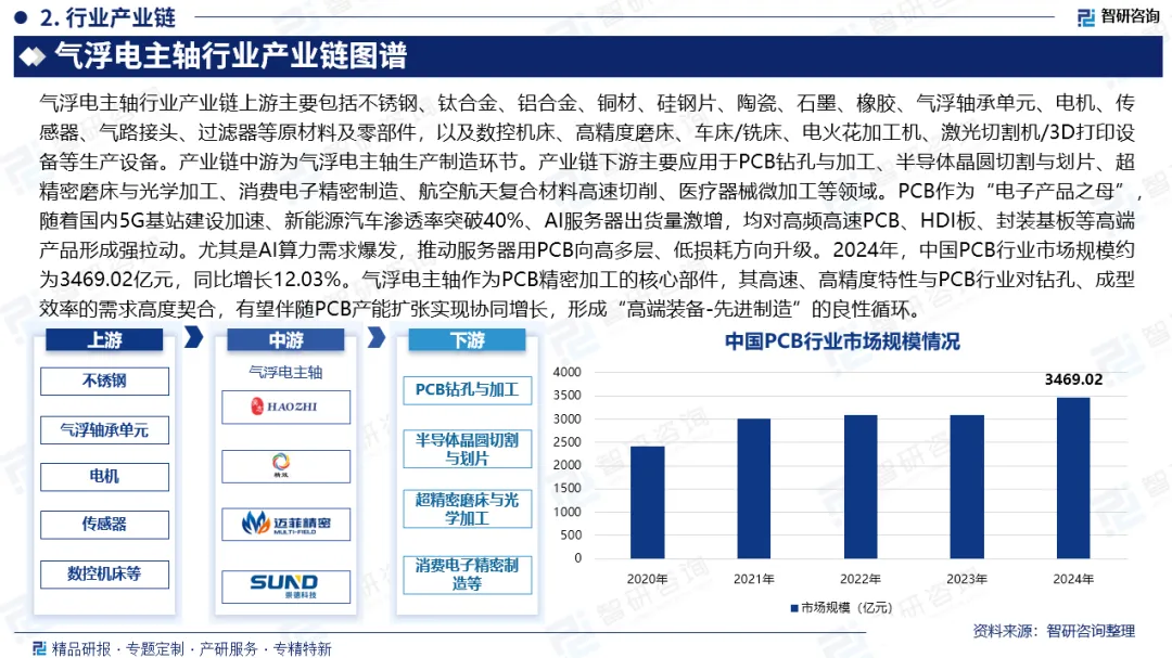 产业链核心节点:气浮电主轴行业产业链上游主要包括不锈钢、钛合金、铝合金、铜材、硅钢片、陶瓷、石墨、橡胶、气浮轴承单元、电机、传感器、气路接头、过滤器等原材料及零部件,以及数控机床、高精度磨床、车床/铣床、电火花加工机、激光切割机/3D打印设备等生产设备。产业链中游为气浮电主轴生产制造环节。产业链下游主要应用于PCB钻孔与加工、半导体晶圆切割与划片、超精密磨床与光学加工、消费电子精密制造、航空航天复合材料高速切削、医疗器械微加工等领域。