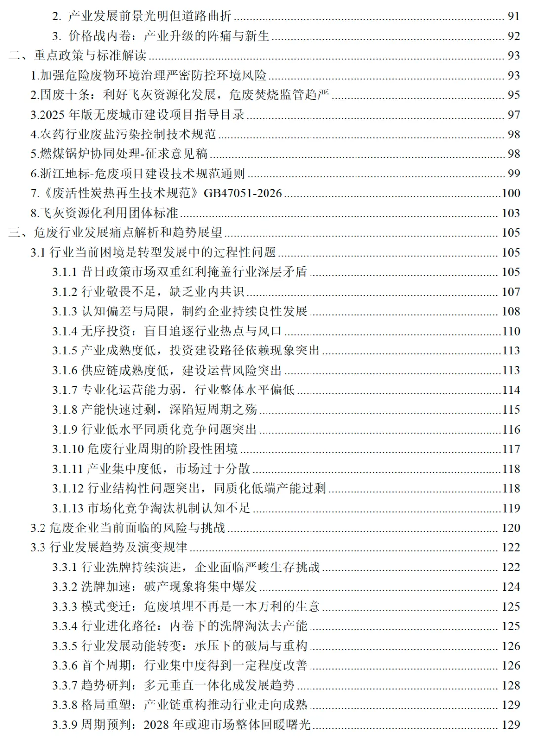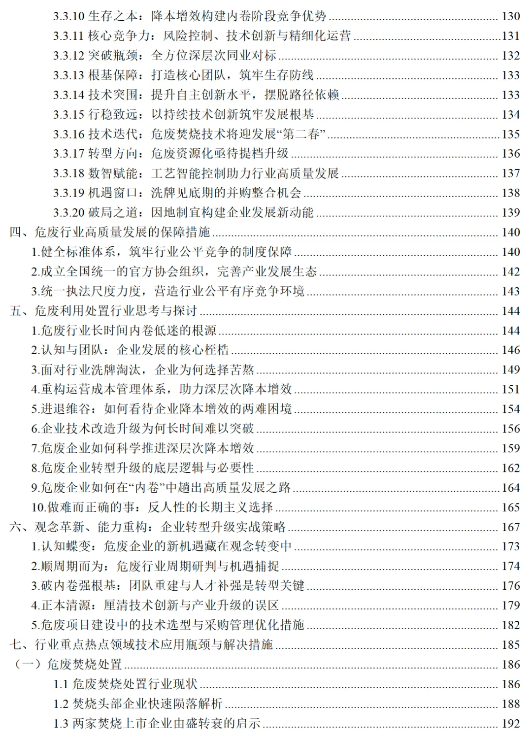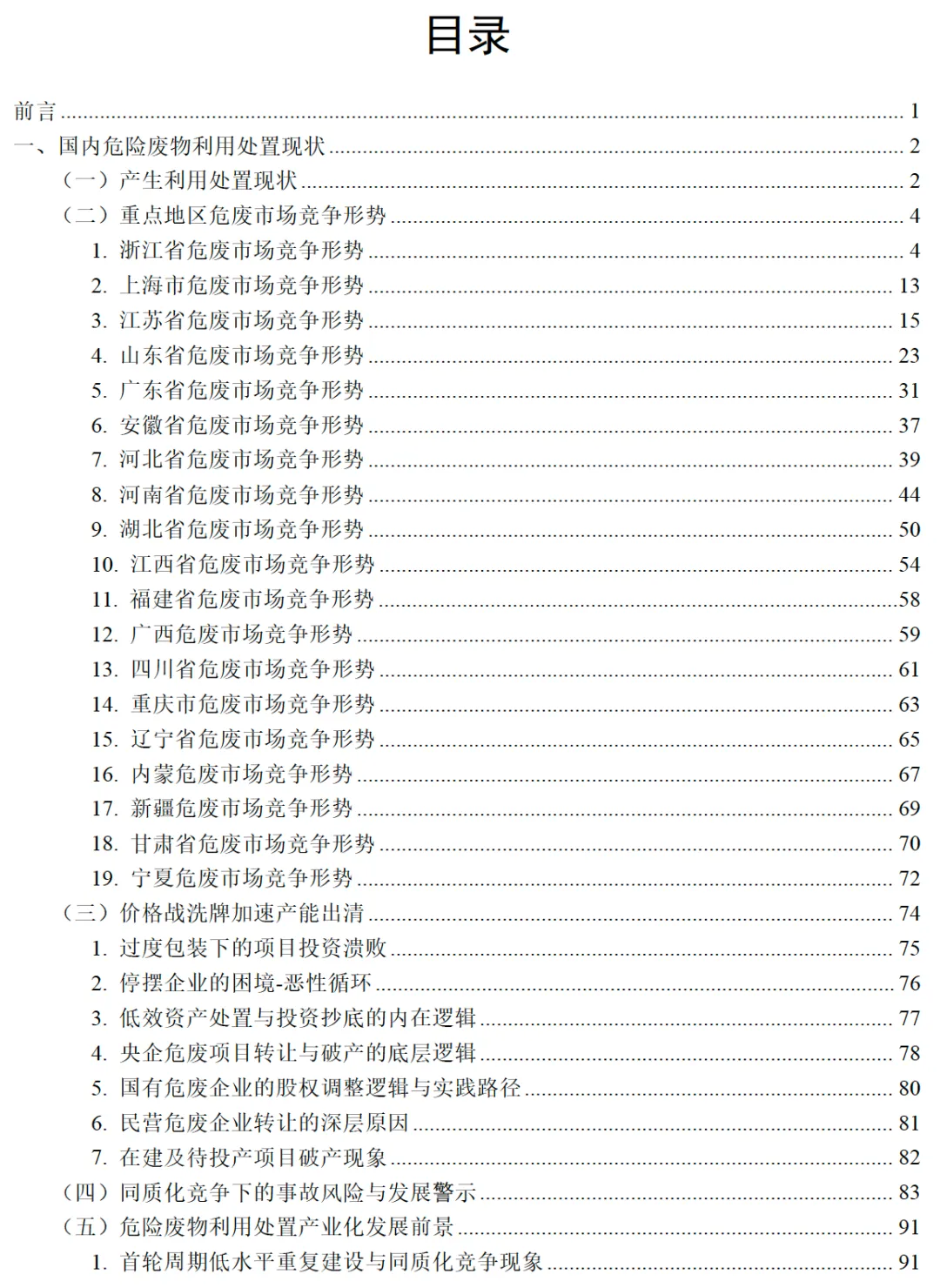 当前,我国危险废物利用处置行业正处于价格战洗牌、产能加速出清、行业格局重构的关键转型窗口期。低价竞争持续挤压盈利空间、低效产能接连退出市场、同质化内卷愈演愈烈,传统依靠牌照红利、规模扩张、粗放运营的发展模式已难以为继。临渊羡鱼,不如退而结网,在内卷与机遇并存的产业新阶段,唯有看清大势、找准痛点、精准破局,才能实现从被动苦熬向主动升级跨越,在行业洗牌中抢占先机。为助力危废企业穿透周期迷雾、破解经营困境、明确转型升级路径,重磅推出《危险废物利用处置产业转型升级研究报告》。报告立足国内危废利用处置产业实践,以数据为基、以政策为引、以技术为核、以实战为要,系统梳理行业格局、深度解析发展痛点、精准研判趋势规律、全面给出破局方案,为危废企业战略定位、项目投资、技术选型、降本增效、同业对标、高质量发展提供系统性、专业化、可落地的决策支撑,是当前企业突破内卷、实现可持续发展的核心参考指南。报告系统概述全国危险废物产生量、利用处置结构、供需格局及行业发展阶段,以数据勾勒产业基本面,让企业清晰把握行业总量、结构与发展底色。同时深度覆盖浙江、上海、江苏、山东、广东、安徽、河北、河南、湖北、江西、福建、广西、四川、重庆、辽宁、内蒙古、新疆、甘肃、宁夏等19个重点省份,逐一剖析各区域危废市场竞争格局及供需差异,帮助企业精准定位自身在行业中的位置,为同业对标、改扩建项目规划、技术创新方向、市场战略布局提供科学依据。当前行业正处于价格战洗牌加速期,产能出清进程显著加快。报告系统剖析各类危废项目与企业淘汰出局的内在逻辑,覆盖:央企危废项目转让、国有危废企业股权调整的战略逻辑;民营企业主动转让退出、在建及待投产项目陷入破产程序的深层原因。同时聚焦2025年同质化竞争下的行业事故风险与发展警示,复盘安全环保、运营失稳、资金断裂等典型问题,为企业识别风险、稳健经营、规避盲目投资提供重要警示。报告对行业长期发展前景进行系统性解读,客观指出:当前行业困境是转型发展中的过程性问题,首轮周期内低水平重复建设、同质化无序竞争是历史成因;行业整体前景光明但过程曲折,本轮价格战内卷本质上是产业升级的必经阵痛,也是行业优胜劣汰、迈向高质量发展的新生契机。报告逐条解读企业面临的风险与挑战,深度总结行业发展规律与演变趋势,帮助企业顺应周期、踩准节奏,避免战略误判与低效投入。紧扣行业最新政策与技术标准,对固废十条、活性炭热再生技术规范、飞灰资源化利用等热点领域进行深度解读,明确政策出台背景、监管导向、实施要求与产业影响,帮助企业把握合规底线、用好政策导向、抢占政策红利,让转型升级始终走在合规轨道。聚焦行业最受关注的现实问题与共性痛点,展开深度思考与专业分析:行业为何长期陷入内卷低迷,认知局限与团队短板如何制约企业发展;如何重构运营成本管理体系,实现深层次、本质化降本增效;内卷环境下如何走出高质量发展新路,坚持做难而正确的事。报告从观念革新、能力重构出发,提出可落地、可执行的转型升级策略:优化项目改扩建中的技术选型、采购管控与投资风险防范。作为报告核心亮点,本部分围绕危废焚烧处置、飞灰资源化利用、活性炭再生、废盐资源化四大热点领域,系统梳理发展现状、技术瓶颈、升级路径与投资风险,为企业技术改造与业务布局提供硬核支撑。焚烧仍是危废行业主流赛道,但行业已出现明显分化。报告深度解析焚烧头部企业快速陨落、两家涉足焚烧业务的上市企业由盛转衰的底层原因,揭示运营管理、技术创新、成本控制、战略决策对企业兴衰的决定性作用。从当前危废焚烧灰渣大量委外填埋,看焚烧技术升级的紧迫性与方向;2026年首个高温气化熔融项目技术解析与产业化前景;警示危废气化焚烧项目建成后再新建回转窑焚烧线的投资风险;焚烧企业转型布局资源化业务,切忌照抄照搬、盲目跟风;飞灰资源化已从试点探索迈向产业化落地阶段,报告进行全链条深度分析:主流技术路径对比,各路线优缺点、技术创新方向与适用场景;飞灰资源化“EPC+O”模式的创新价值与落地要点;市场普遍谨慎的飞灰熔融技术,为何仍持续获得资本关注;明确飞灰资源化技术路线选择是重点,但并非成功关键;飞灰资源化中试项目密集落地的内在逻辑与科学实施要点;飞灰资源化技术迭代、区域深耕与资本加持的发展范式;贵州、福建、河南、浙江、湖南等省份飞灰资源化市场现状、价格水平、落地案例与产业化进展;新建活性炭再生项目高质量建设与稳定运营的实现路径;危废焚烧回转窑改造为活性炭再生项目的投资技术经济风险;废活性炭再生协同废树脂碳化活化制备活性炭的投资与技术风险;深度剖析危废行业废盐资源化“叫好不叫座”的产业现象与根源;报告还提出危废行业高质量发展保障措施,从政策措施、协会组织、执法监管、行业准入门槛等维度进行分析,构建良性竞争市场秩序,助力行业真正摆脱内卷,实现可持续发展。危废行业正处在周期底部与转型拐点叠加的关键阶段,阵痛之中孕育新生,内卷之下蕴藏机遇。《危险废物利用处置产业转型升级研究报告》以全视角、深逻辑、强实战的专业内容,为企