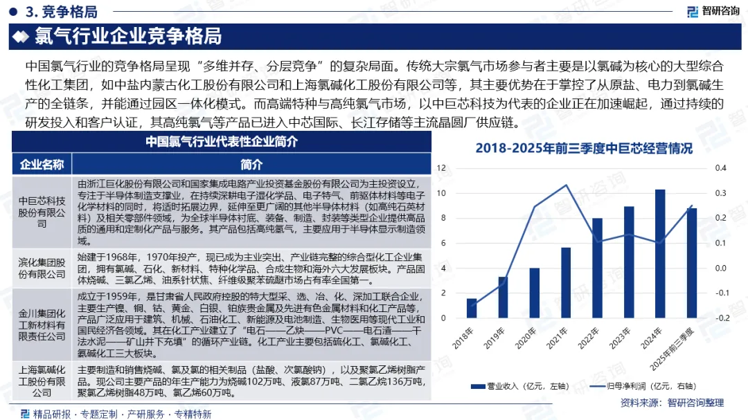 竞争情况:中国氯气行业的竞争格局呈现“多维并存、分层竞争”的复杂局面。传统大宗氯气市场参与者主要是以氯碱为核心的大型综合性化工集团,如中盐内蒙古化工股份有限公司和上海氯碱化工股份有限公司等,其主要优势在于掌控了从原盐、电力到氯碱生产的全链条,并能通过园区一体化模式。而高端特种与高纯氯气市场,以中巨芯科技为代表的企业正在加速崛起,通过持续的研发投入和客户认证,其高纯氯气等产品已进入中芯国际、长江存储等主流晶圆厂供应链。