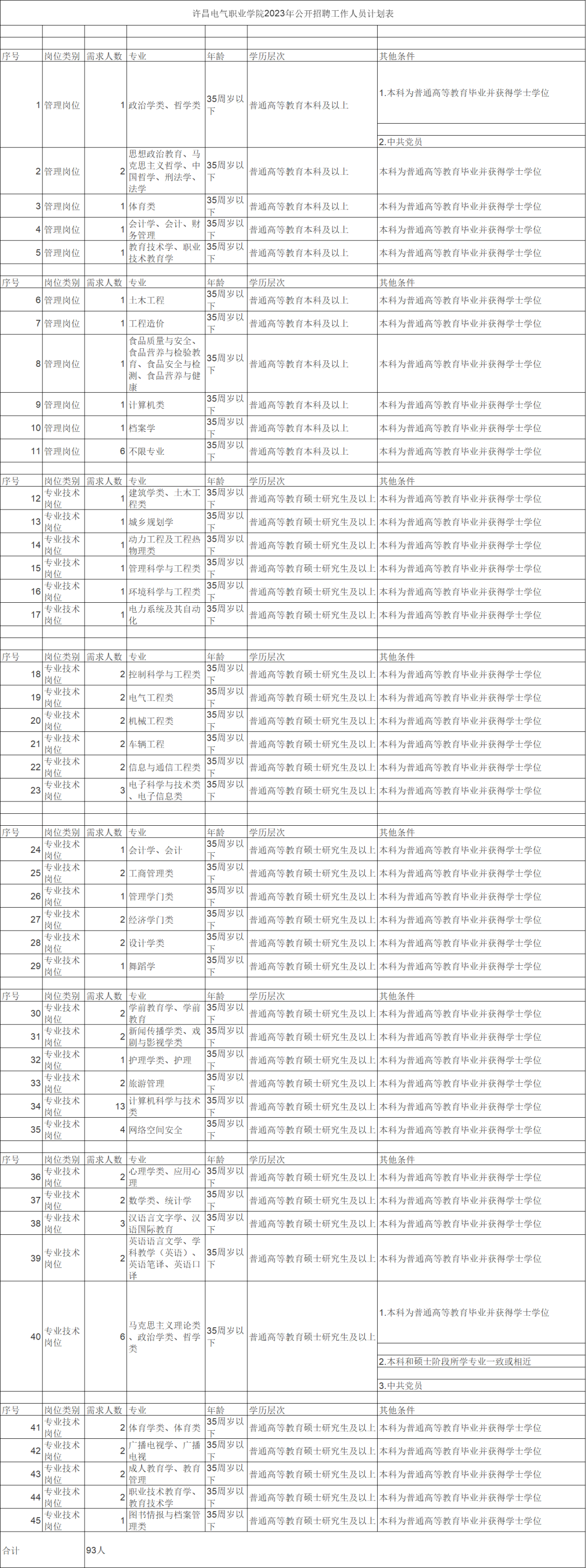 计划招聘93名(具体招聘岗位和资格条件见附件《许昌电气职业学院2023年公开招聘工作人员计划》)。