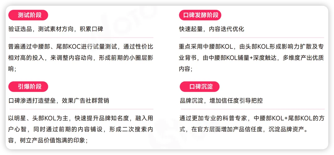 成熟品牌则可遵循测试-引爆-口碑发酵-沉淀四步走,中小品牌聚焦精准种草,大品牌侧重全域覆盖,实现资源最优配置。
