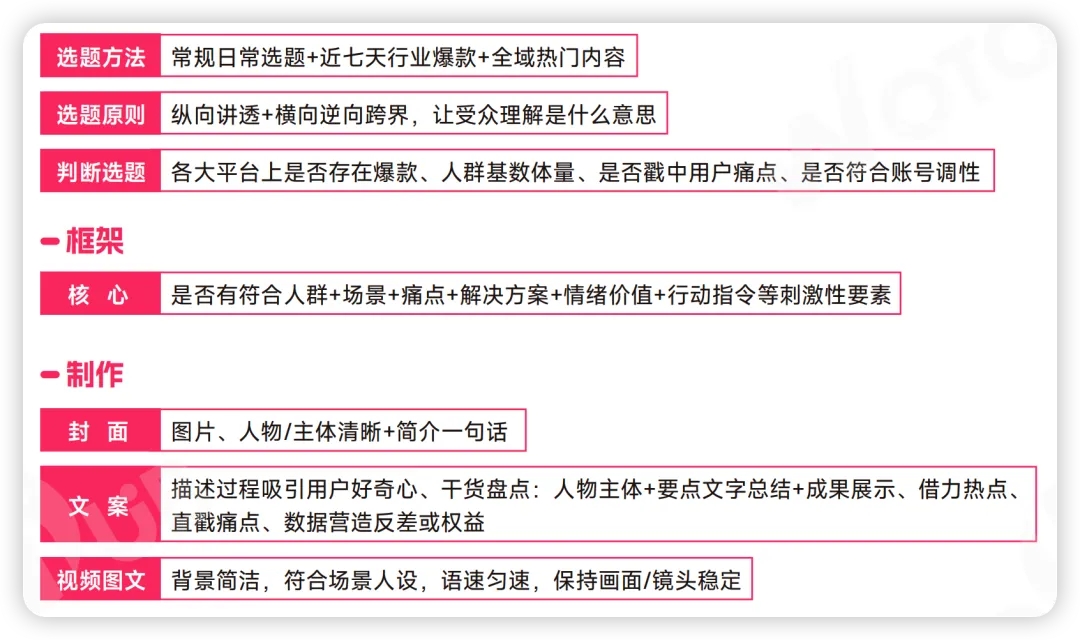 美妆、家居、宠物、穿搭、数码、健身、母婴、vlog 等八大热门赛道,内容形式与用户偏好差异显著。红人内容运营遵循选题-框架-制作-复盘标准化流程,爆款内容具备黄金开场、价值突出、逻辑清晰、记忆点鲜明四大特征。