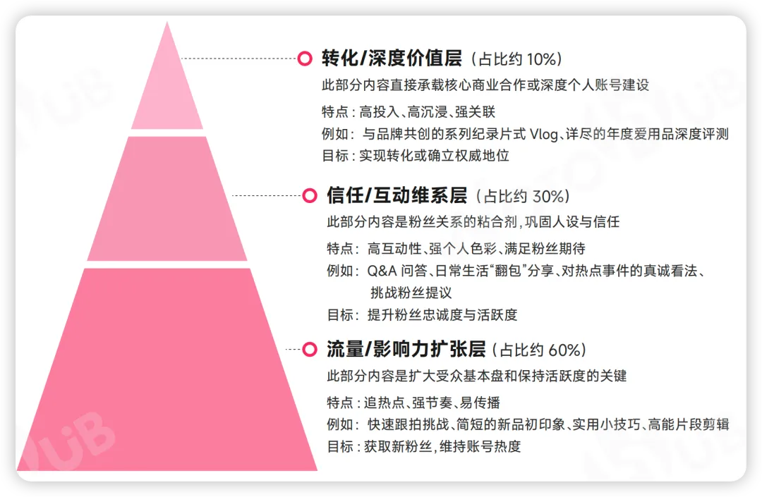 红人内容创作坚持内核原生化,构建60%流量内容+30%信任内容 +10%转化内容的金字塔结构,同时通过赛道跨界、形式创新实现差异化,避免内容同质化,提升粉丝粘性与商业价值。