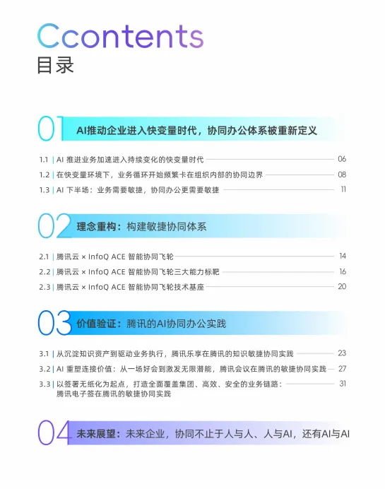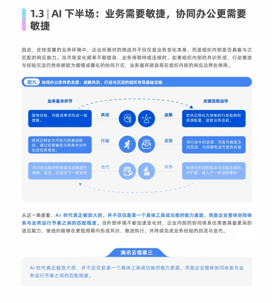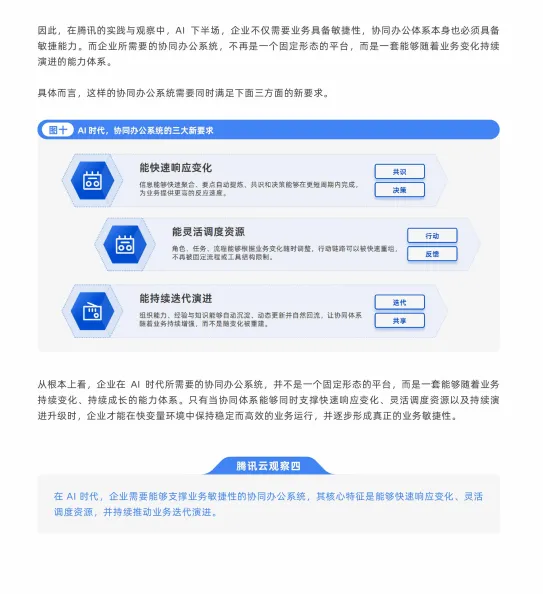 最后,报告展望未来,指出协同办公将进入一个连接人与人、人与AI、以及AI与AI的新阶段。协同体系将演变为一个由多种AI能力共同驱动、围绕业务场景自动协同的智能网络。腾讯将持续在此方向探索,旨在帮助企业构建能够随业务持续演进、支撑业务敏捷性的协同能力体系。