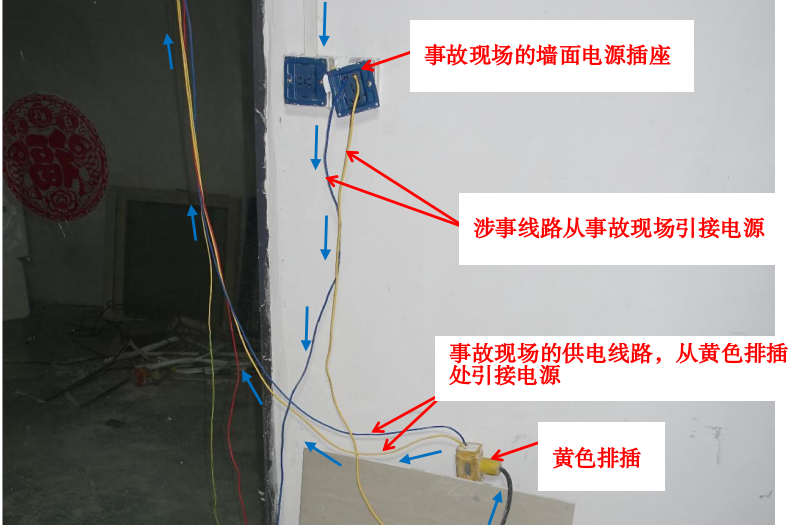 图2 模拟还原事发时现场情况及上方天花板的安装区域- 现场用电情况:902室的总电源开关箱未连接输出输入线路,事故现场没有从该总电源开关箱处引接电源。黄色排插(以下简称涉事排插)的插头插在电梯间的应急灯电源插座处(见图3),作为902室施工现场的供电电源连接线路。902室内的供电线路从天花板上的金属线槽内引出插在黄色排插上(见图4),使902室户内通电。旁边房间使用的1个自制延长线电源插座(见图5)的电源线(涉事线路)插在902室内的墙面电源插座上,该线路的线端绝缘层已剥开,其内部导体直接插在插座处,作为隔壁房间的电源使用。