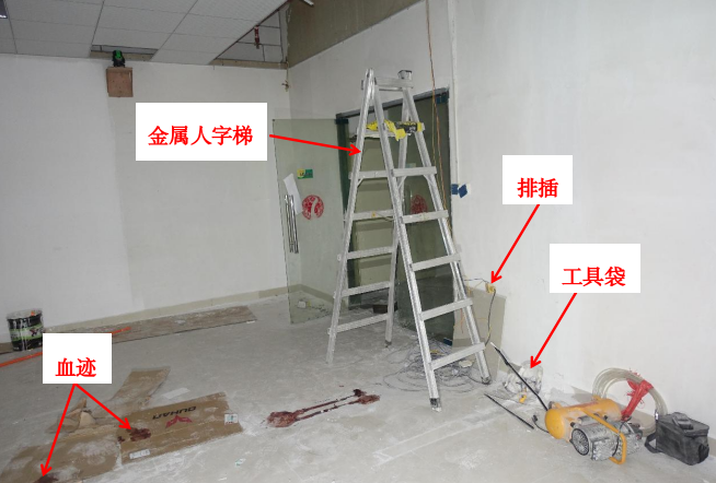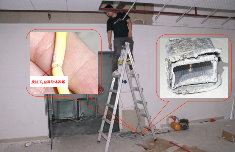 2. 现场作业环境情况:涉事线路凌乱放置在梯脚附近(放置在902室的入门左侧),目击者称事发时死者骑在人字梯上横向挪动,踢脚压到地面上的电线。经现场勘查,该梯脚的防滑脚套已破损压在地面上的涉事线路,导致黄色电线的绝缘层破损(见图6)。天花板处有金属线槽、金属龙骨、铁丝等金属部件,当死者站在人字梯的第5级梯棍上方作业时,其肢体能触碰到上部的金属部件。