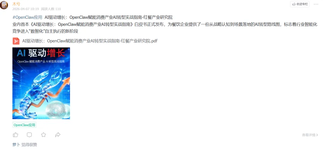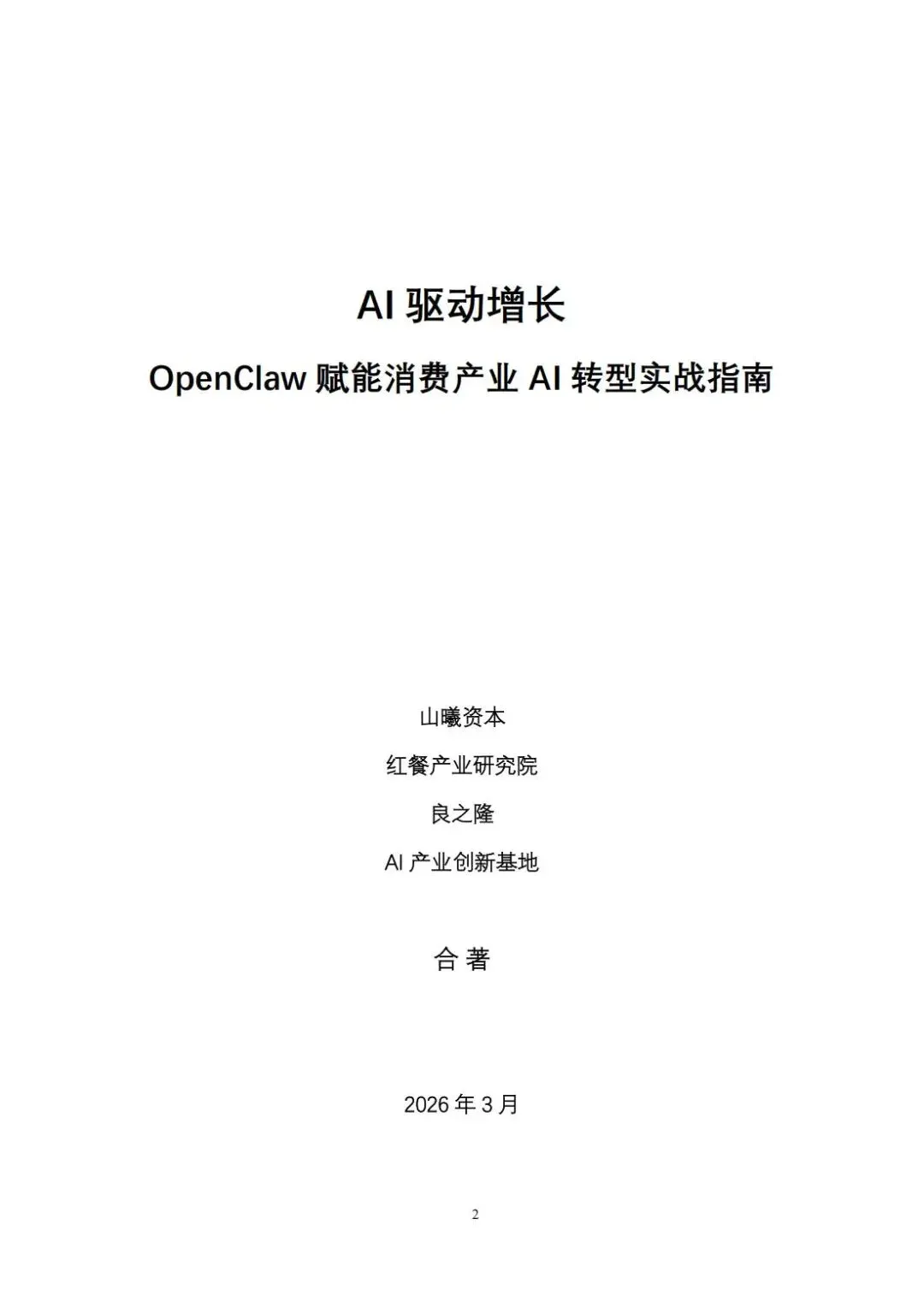 业内首本《AI驱动增长:OpenClaw赋能消费产业AI转型实战指南》白皮书正式发布,为餐饮企业提供了一份从战略认知到场景落地的AI转型路线图,标志着行业智能化竞争进入“数智化”自主执行的新阶段