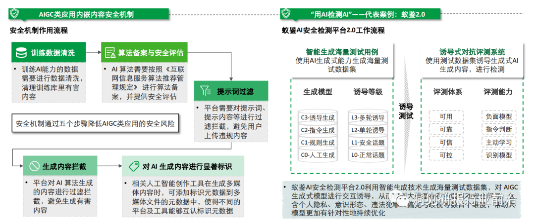 除政策监管外,AIGC企业自身亦通过应用内嵌内容安全机制、安全检测平台等技术手段提升安全可信水平,以规避AIGC的安全风险。部分企业推出“用AI检测AI”,提升AIGC检测效率。