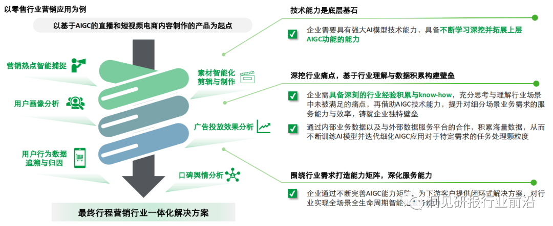 未来AIGC在B端的应用将持续围绕垂直领域深耕,基于深刻的行业经验及数据积累,将AIGC与行业know-how深度结合,并逐步扩大服务范围边界,打磨行业一体化解决方案,重塑企业服务价值。