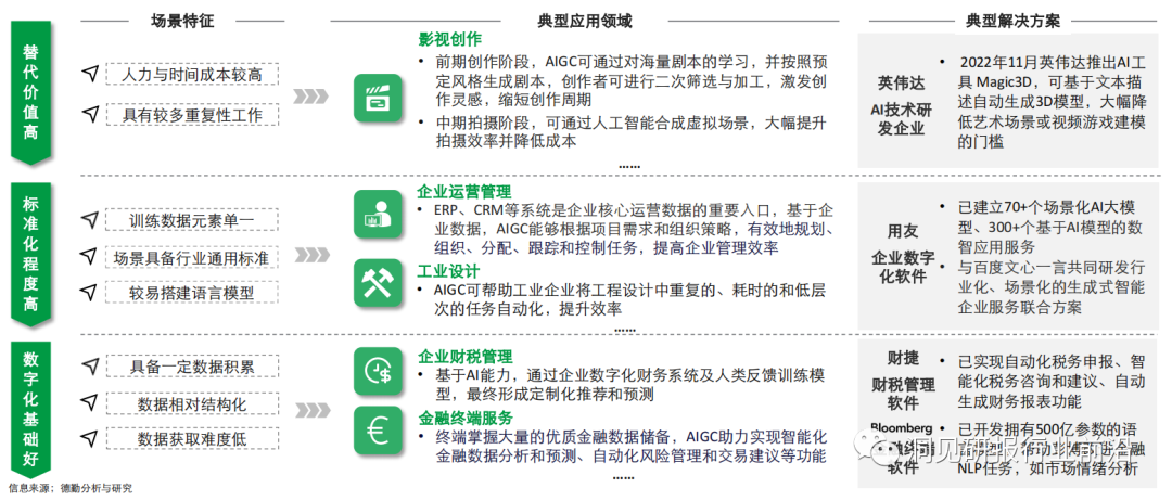当前AIGC针对B端的应用主要围绕降本增效展开,替代价值高、标准化程度高及良好的数字化基础的行业将是AIGC率先渗透的场景。