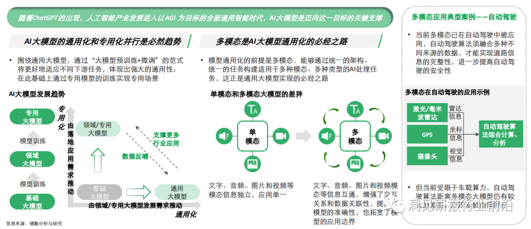 人工智能产业正在进入以人工通用智能(AGI)为目标的新时代,AI大模型是迈向这一新时代的关键支撑。通用化和专用化并行是AI大模型发展的必然趋势,而多模态是AI大模型通用化的必经之路。