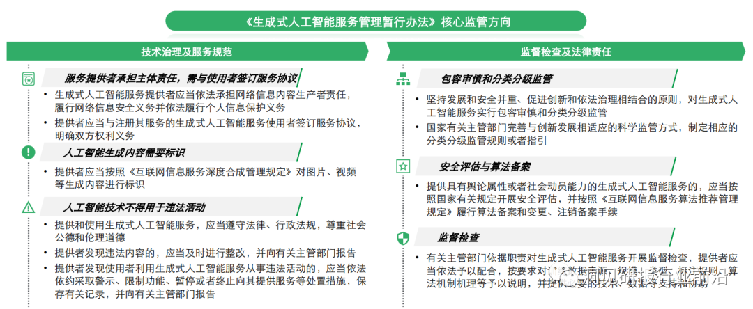 《生成式人工智能服务管理暂行办法》作为我国首个AIGC监管文件,将于2023年8月15日起正式实施,从技术治理、服务规范、监督检查和法律责任等维度对AIGC的良性发展进行监管引导。