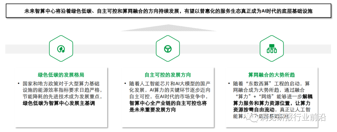 绿色低碳发展、产业链自主可控、智能算力和基础网络的算网融合是未来智算中心的重要发展趋势,也是智算中心真正成为中国AI时代核心底层基础设施的关键提升路径。