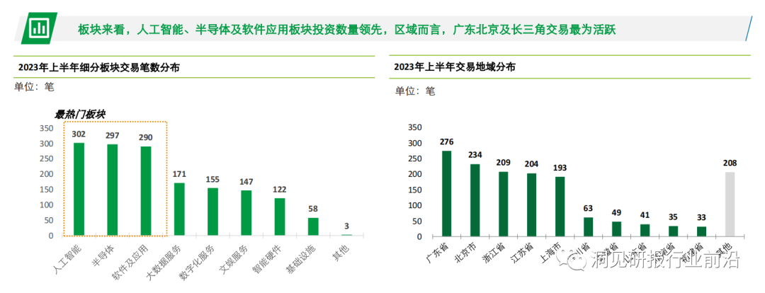 2023年上半年TMT行业投融资以人工智能、半导体和应用开发为最热门的赛道;从地域看,以广东、北京和长三角为代表的发达省市仍旧是TMT投融资的活跃地区。
