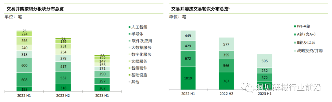 结合趋势看,受宏观环境影响,TMT行业投资放缓,交易数量持续下降:半导体和软件应用热度褪去,但人工智能板块逆势崛起;交易轮次来看,市场对早期标的表现出审慎态度,但对优质资产的战略投资/并购有所攀升。
