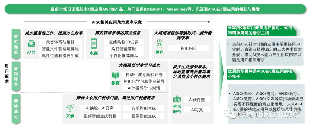 AIGC在C端涌现出较多应用,一方面围绕用户省时提效、省钱降本和精神满足的诉求,另一方面结合优质的场景进行商业化落地。