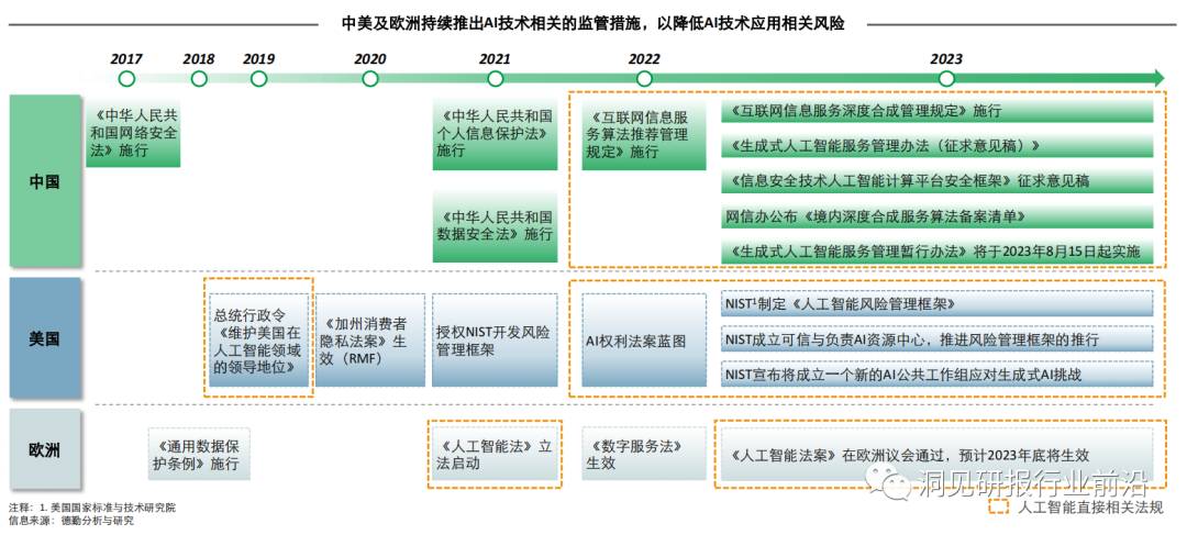 全球各地区均颁布相关政策法案对AI技术及服务进行监管,以降低AIGC的安全风险,尤其自2022年底ChatGPT推出后,世界主要经济体均加速了对AI产业监管政策的出台。