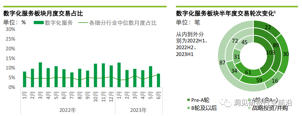 数字化服务板块投资整体较为平稳,从轮次来看,2022年以来资本对于数字化服务板块的投资显著转向B轮以后及战略投资和并购,对于早期投资的规避明显。