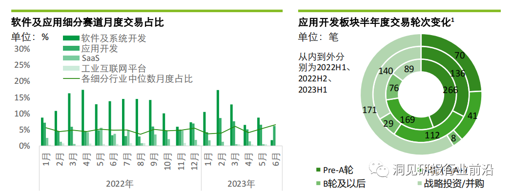 2023年上半年软件及应用板块交易热度下滑,战略投资/并购项目占比大幅攀升,呈现行业整合趋势。