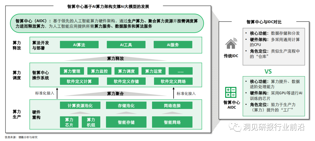 区别于传统IDC扮演的“仓库”角色,智算中心(AIDC)基于领先的人工智能计算架构,通过生产、聚合、调度并释放算力为AI算法开发应用提供底层算力支撑,在AI时代扮演“工厂”角色。
