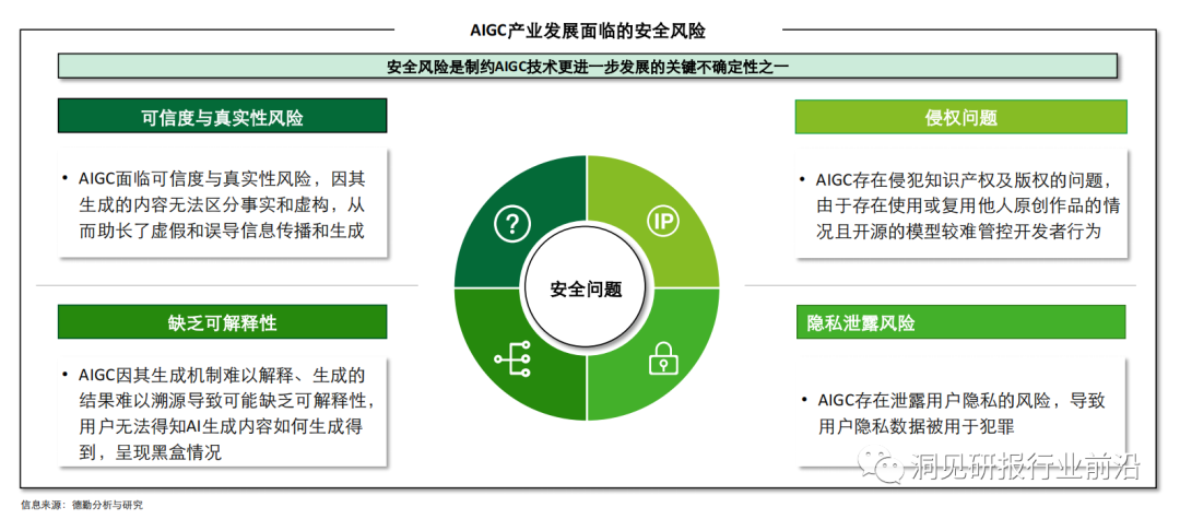 AI的发展和AIGC的快速应用伴随诸多风险,其中安全问题是制约AIGC能否发展成为安全可靠技术的关键,包括可信度与真实性问题、侵权问题、缺乏可解释性以及隐私泄露风险等。