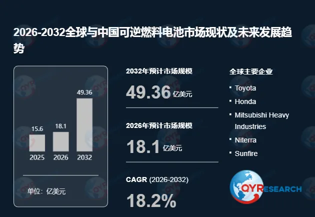 根据QYR(恒州博智)的统计及预测,2025年全球可逆燃料电池市场销售额达到了15.60亿美元,预计2032年将达到49.36亿美元,年复合增长率(CAGR)为18.2%(2026-2032)