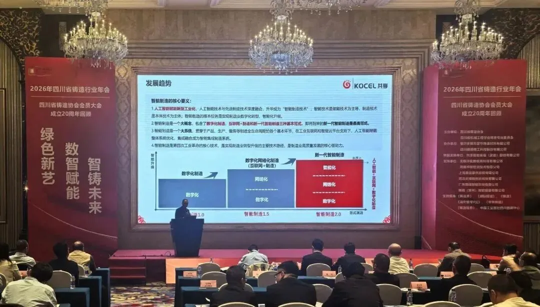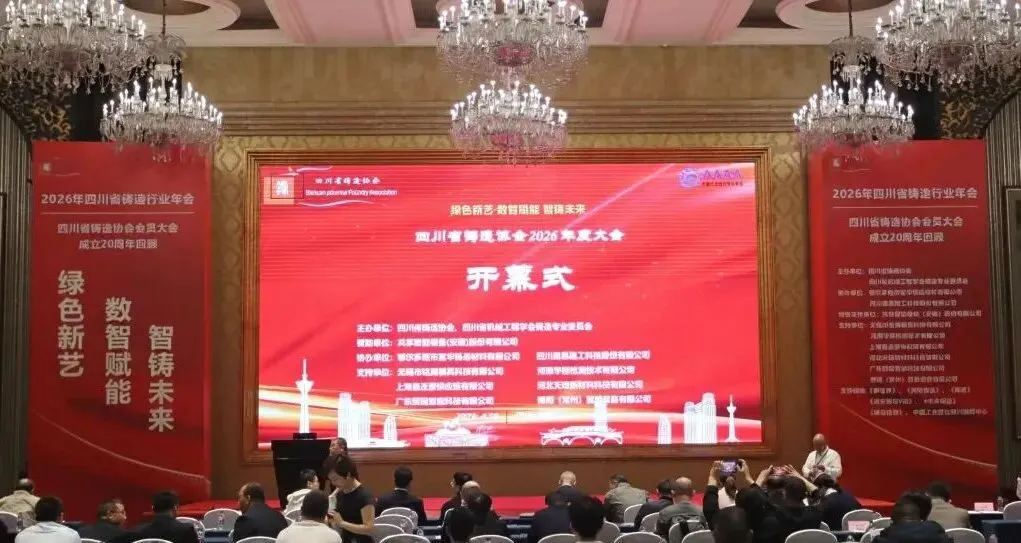 2026年4月10日,2026年四川省铸造行业年会暨四川省铸造协会会员大会在成都雅居乐豪生大酒店召开,年会以“绿色新艺 数智赋能 智铸未来”为主题,吸引了众多铸造及上下游行业专家、学者、企业相关负责人与会。