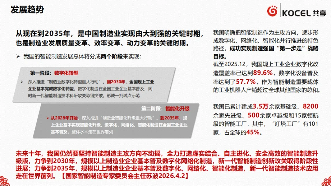 当前,我国智能制造发展正处在“数字化转型”与“智能化升级”推进的关键阶段。根据国家战略部署,到2030年,全国规上工业企业将基本完成数字化转型;到2035年,数字化、网络化、智能化制造将在全国工业企业基本普及。