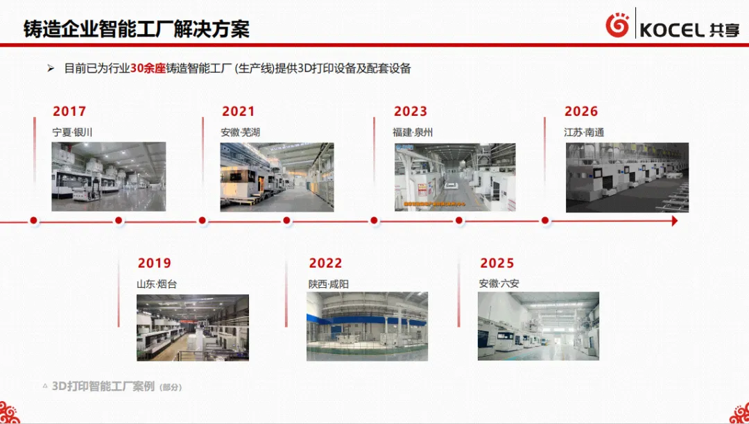 针对智能工厂建设,杨总分享了全球首座万吨级铸造3D打印成形智能工厂、全球最大规模基于3D打印的铸钢件全流程智能工厂等标杆案例。通过集成砂型3D打印设备、集中供液供砂系统、全自动熔炼浇注及精整单元系统,以及AGV、立体库等设施,在3D打印技术加持下带来人效倍增、生产周期减半、物流成本减半等突出成效。截至目前,国家智能铸造产业创新中心已设计建成30余座行业领先的铸造智能工厂(生产线),示范效应显著。