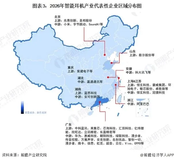 从产业链区域分布来看,智能耳机产业链代表性企业主要分布在广东地区,上海、江苏、北京地区也有分布。