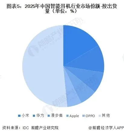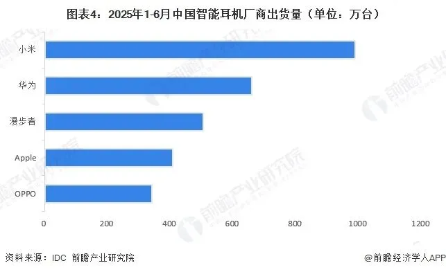 2025年1-6月,小米、华为、漫步者、苹果、OPPO等企业智能耳机出货量位居前五,分别约989万台、660万台、504万台、408万台和342万台。