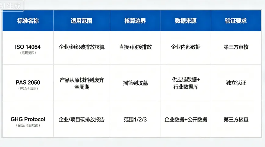 PAS 2050 | 英国标准协会(BSI) | 国际通用,适用于各类商品和服务的碳足迹核算 | 中,允许排除<1%影响的排放环节,数据有效期明确为2年 | ★★☆☆☆(欧盟未纳入优先认可清单,逐步淘汰,仅可作为过渡性核算参考) | 应用时间长,国内企业历史数据丰富,核算流程相对简单,可快速完成基础核算 | 欧盟认可度低,报告无法直接用于CBAM申报,需补充ISO 14067相关核查内容 |