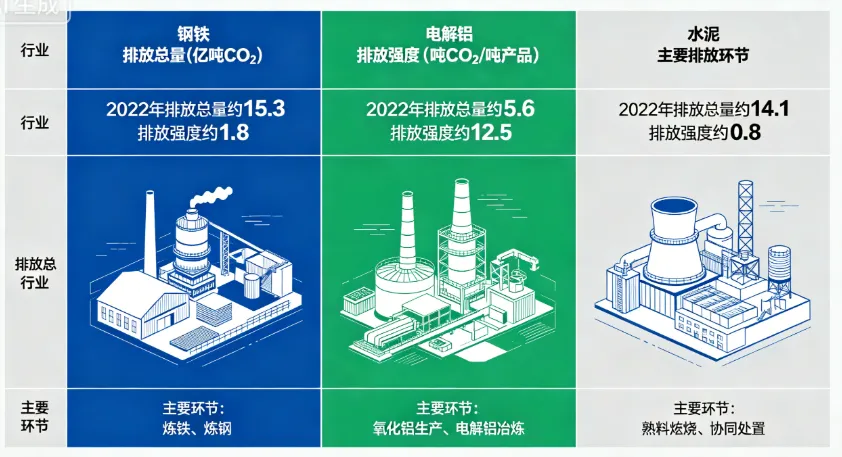 钢铁 | 1. 高炉炼铁工艺排放(占比约50%,主要为CO₂);2. 化石燃料燃烧排放(煤炭、焦炭,占比约30%);3. 烧结、球团工序排放(占比约15%);4. 外购电力间接排放(占比约5%) | 长流程(高炉-转炉):1.8~2.2;短流程(电炉):0.8~1.2 | 1. 高炉/转炉工艺排放实测数据;2. 煤炭、焦炭消耗及排放因子;3. 外购电力排放(电网因子取值);4. 废钢回收利用的减排核算 | 1. 推广电炉短流程生产(替代高炉长流程);2. 氢基竖炉炼铁技术应用;3. 余热回收利用(烧结、炼钢余热发电);4. 废钢高效回收与循环利用 | 长流程企业占比高,工艺排放难以快速减排;废钢回收体系不完善,减排核算难度大 |