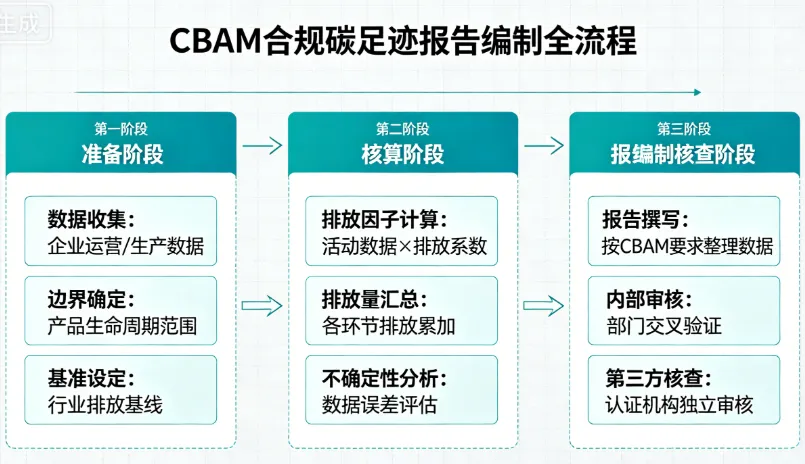 本阶段核心是完成碳足迹报告撰写、内部审核、第三方核查及欧盟系统备案,确保报告符合欧盟CBAM申报要求,具体步骤如下: