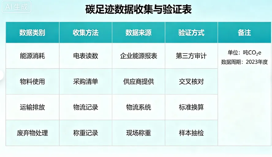 建立完善的数据收集体系:按照ISO 14067及CBAM要求,搭建覆盖“原材料采购-生产加工-产品出厂”全链条的数据收集体系,明确数据收集范围、频率、责任人及留存要求: