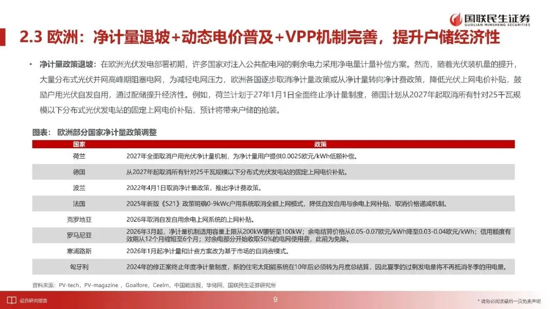 欧洲:收益模式完善+补贴刺激+地缘冲突有望推动需求高增。欧州风光发电占比高影响电网消纳,催生配储需求;2022-2024年间国欧洲户储在户光的平均渗透率为20%,仍处于较低水平,提升潜力较大。欧洲户储收益模式完善,净计量退坡+动态电价普及+VPP机制完善,提升户储经济性;各国陆续推出补贴,刺激户储需求;叠加地缘冲突加剧或推动天然气和电价上涨,户储投资回收期缩短,有望推动欧洲需求高增赠
