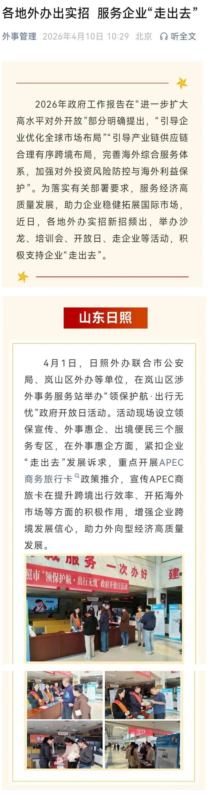 日,外交部“外事管理”微信公众号上发布的《各地外办出实招 服务企业“走出去”》文章中对我市