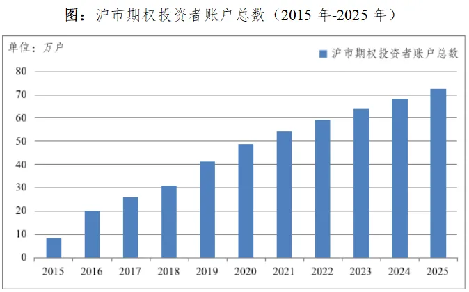 沪市股票期权投资者人数稳步增长,截至2025年底股票期权投资者账户总数达到72.68万户,年内新增4.32万户。