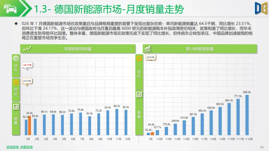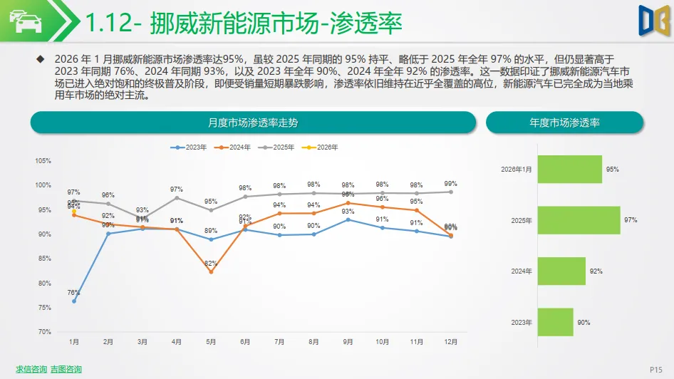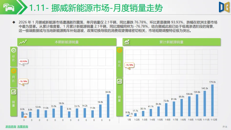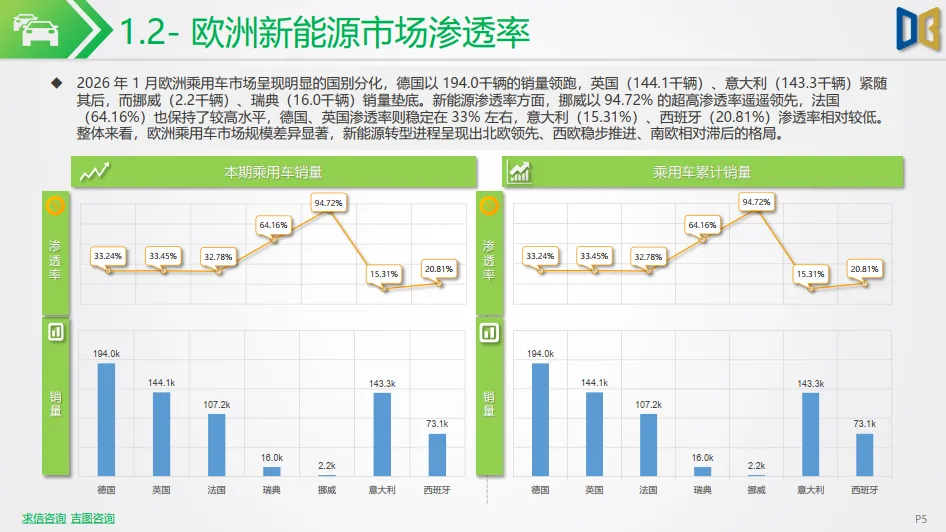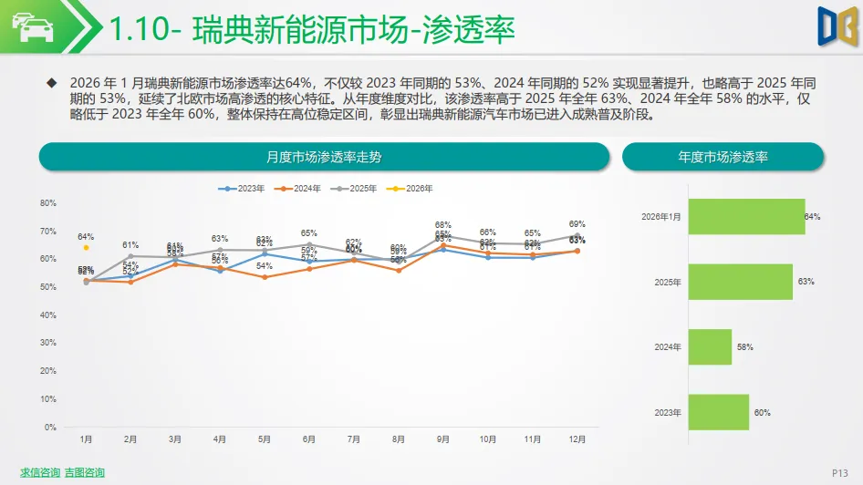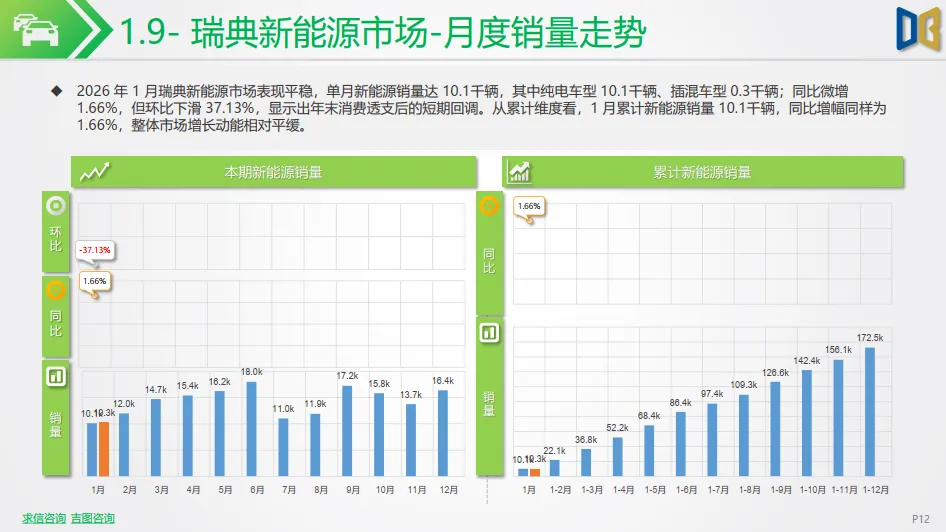 北欧市场呈现分化态势:挪威新能源销量遭遇剧烈震荡,单月销量仅2.1千辆,同比暴跌 76.78%,但渗透率仍高达 95%,市场进入成熟饱和后的短期调整;瑞典市场表现平稳,单月销量10.1k 辆,同比微增 1.66%,渗透率维持在 64% 的高位,延续了北欧市场高渗透的核心特征。