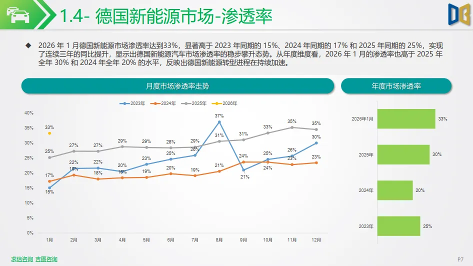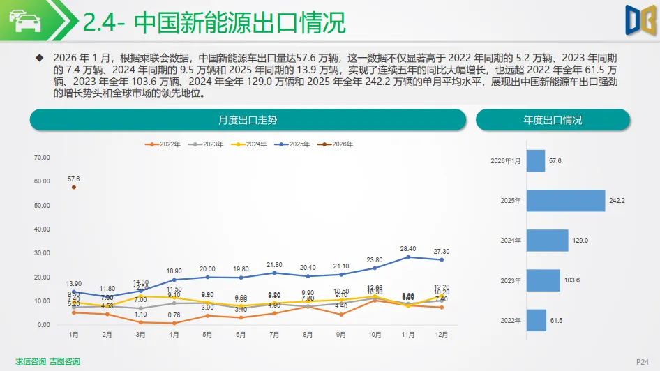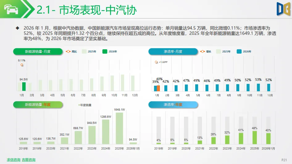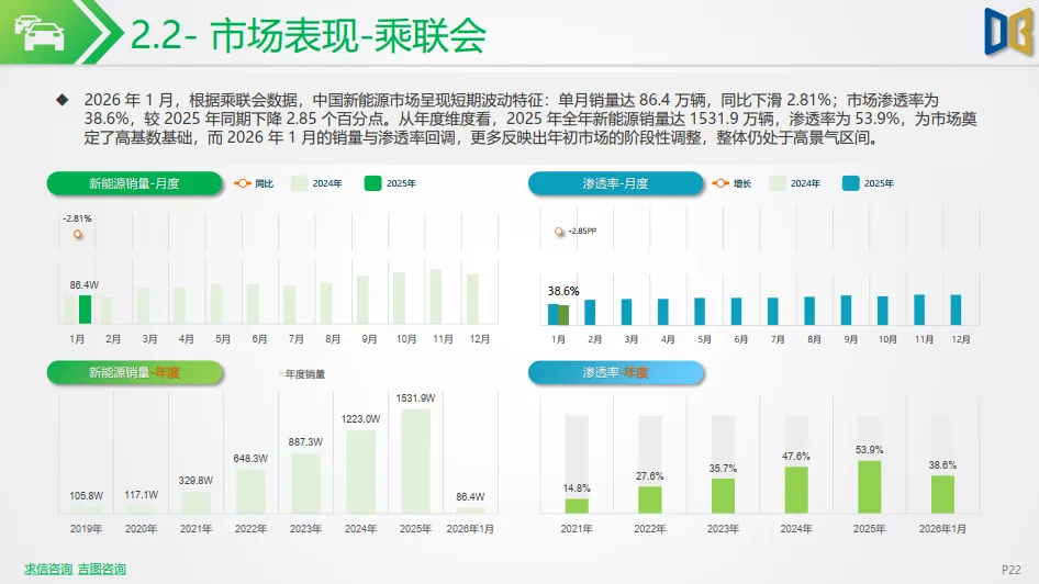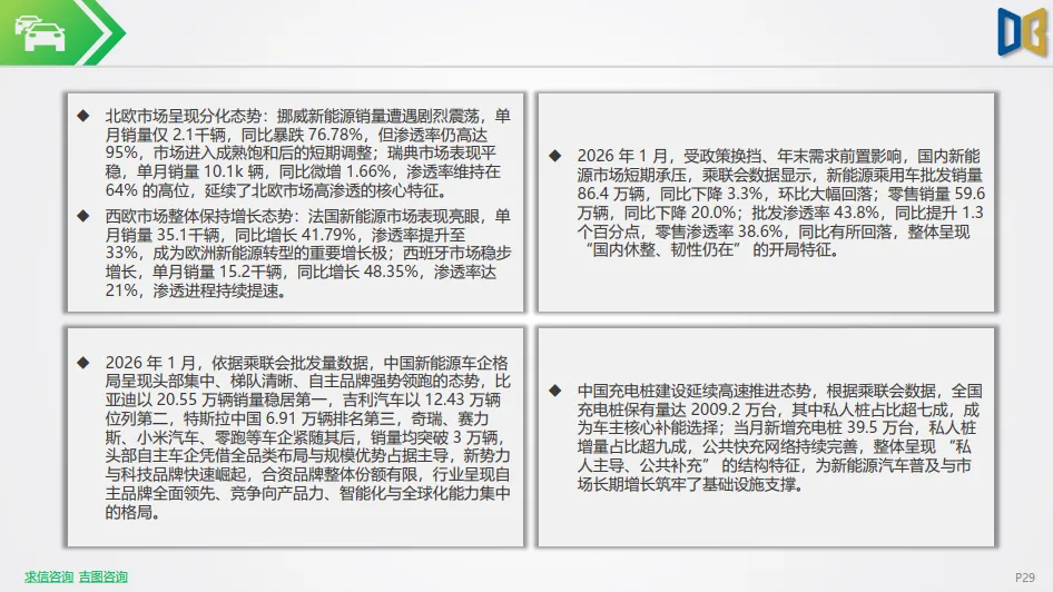 2026 年 1 月,受政策换挡、年末需求前置影响,国内新能源市场短期承压,乘联会数据显示,新能源乘用车批发销量86.4 万辆,同比下降 3.3%,环比大幅回落;零售销量 59.6 万辆,同比下降 20.0%;批发渗透率 43.8%,同比提升 1.3 个百分点,零售渗透率 38.6%,同比有所回落,整体呈现 “国内休整、韧性仍在” 的开局特征。