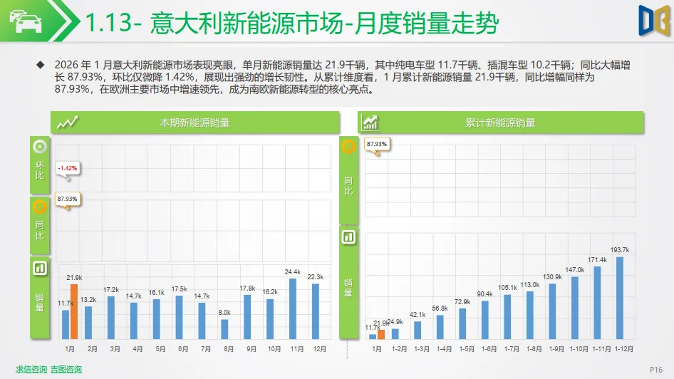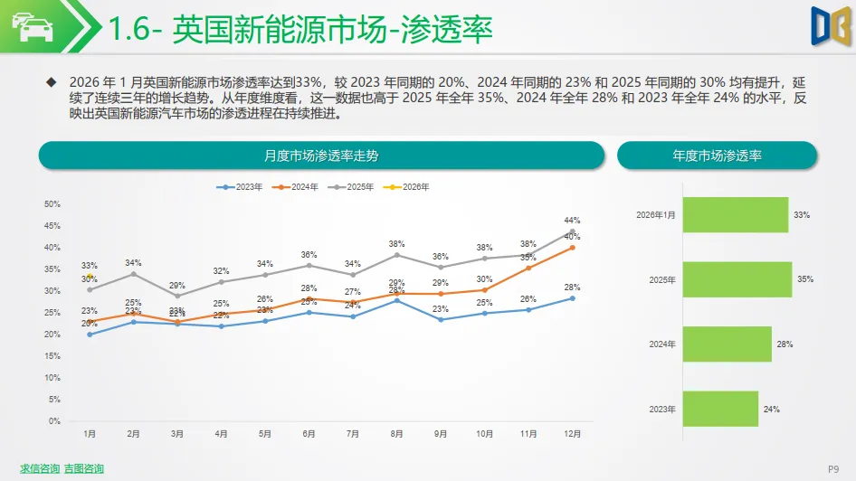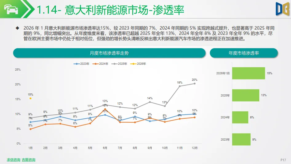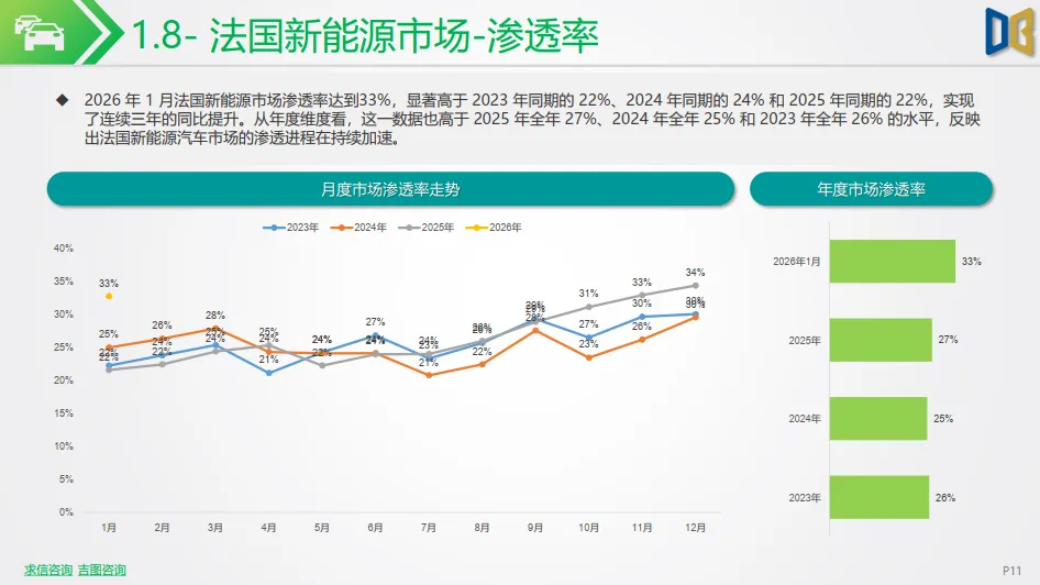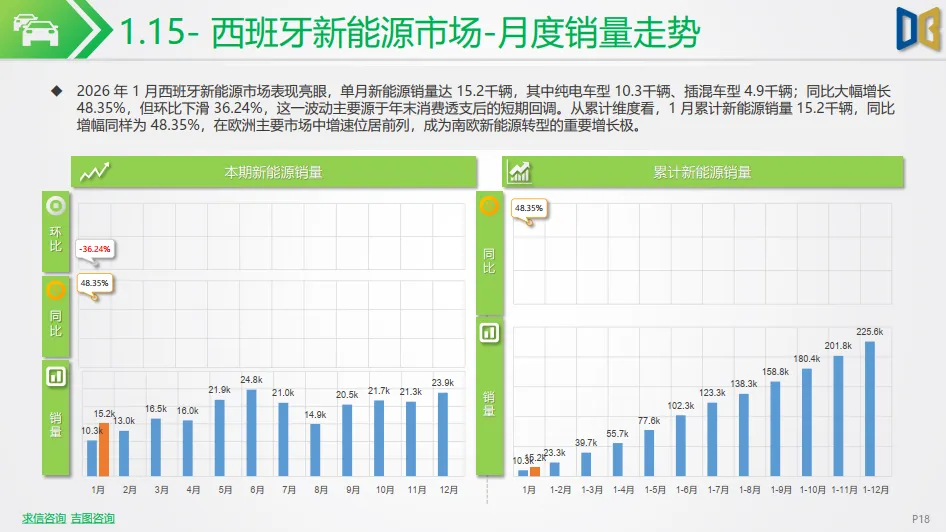 西欧市场整体保持增长态势:法国新能源市场表现亮眼,单月销量35.1千辆,同比增长 41.79%,渗透率提升至 33%,成为欧洲新能源转型的重要增长极;西班牙市场稳步增长,单月销量15.2千辆,同比增长 48.35%,渗透率达 21%,渗透进程持续提速。