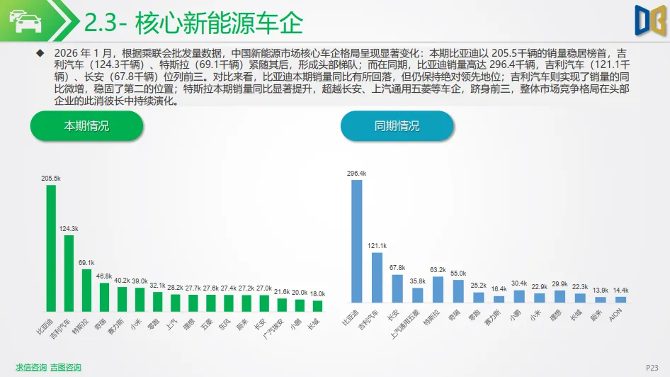 2026 年 1 月,依据乘联会批发量数据,中国新能源车企格局呈现头部集中、梯队清晰、自主品牌强势领跑的态势,比亚迪以20.55 万辆销量稳居第一,吉利汽车以 12.43 万辆位列第二,特斯拉中国 6.91 万辆排名第三,奇瑞、赛力斯、小米汽车、零跑等车企紧随其后,销量均突破3 万辆,头部自主车企凭借全品类布局与规模优势占据主导,新势力与科技品牌快速崛起,合资品牌整体份额有限,行业呈现自主品牌全面领先、竞争向产品力、智能化与全球化能力集中的格局。