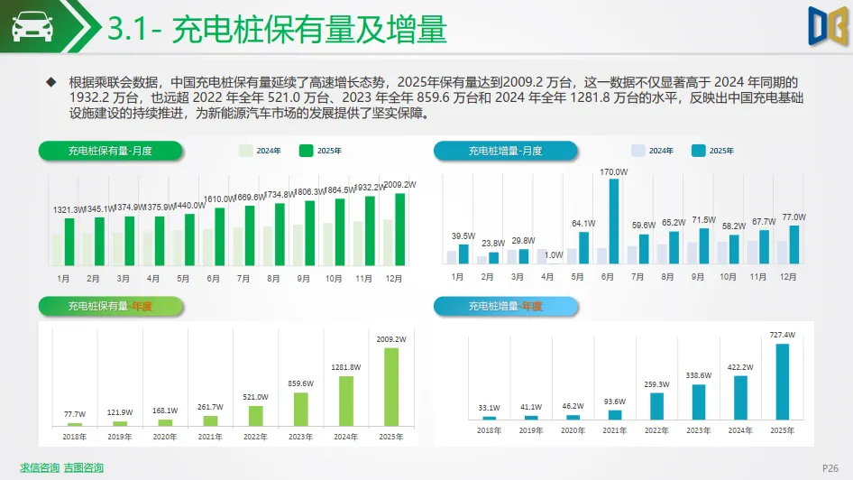 中国充电桩建设延续高速推进态势,根据乘联会数据,全国充电桩保有量达2009.2 万台,其中私人桩占比超七成,成为车主核心补能选择;当月新增充电桩39.5 万台,私人桩增量占比超九成,公共快充网络持续完善,整体呈现 “私人主导、公共补充” 的结构特征,为新能源汽车普及与市场长期增长筑牢了基础设施支撑。